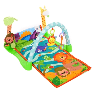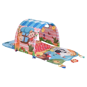 Развивающий коврик для новорождённого становится домашней «мини‑площадкой»: ребёнок лежит на животе или спине, рассматривает рисунки, пробует тянуться к подвескам, учится переворачиваться и ползти. Разнообразные цвета, изображения животных и сказочных персонажей, шуршащие и тактильные элементы стимулируют зрение, слух, внимание и координацию движений, при этом поверхность коврика мягко амортизирует небольшие падения и защищает от холодного пола.