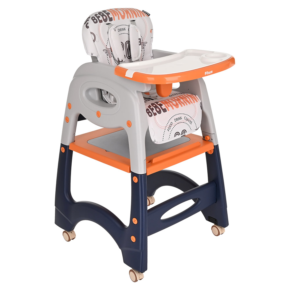 В собранном виде может быть высоким стульчиком для кормления со съемным регулируемым столиком и 5-точечными страховочными ремнями безопасности.