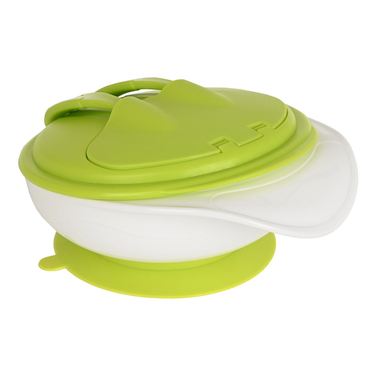 Детская тарелочка с крышкой на присоске - плотно прилипает к поверхности стола - удобная, легкая, прочная. Тарелка оснащена специальной присоской, благодаря которой емкость не будет скользить и не опрокинется от неловких движений. В ней легко можно хранить еду в холодильнике, а также кормить малыша. На крышке имеется специальное отделение для ложечки  и вилки, что позволит легко и компактно использовать набор в поездках.